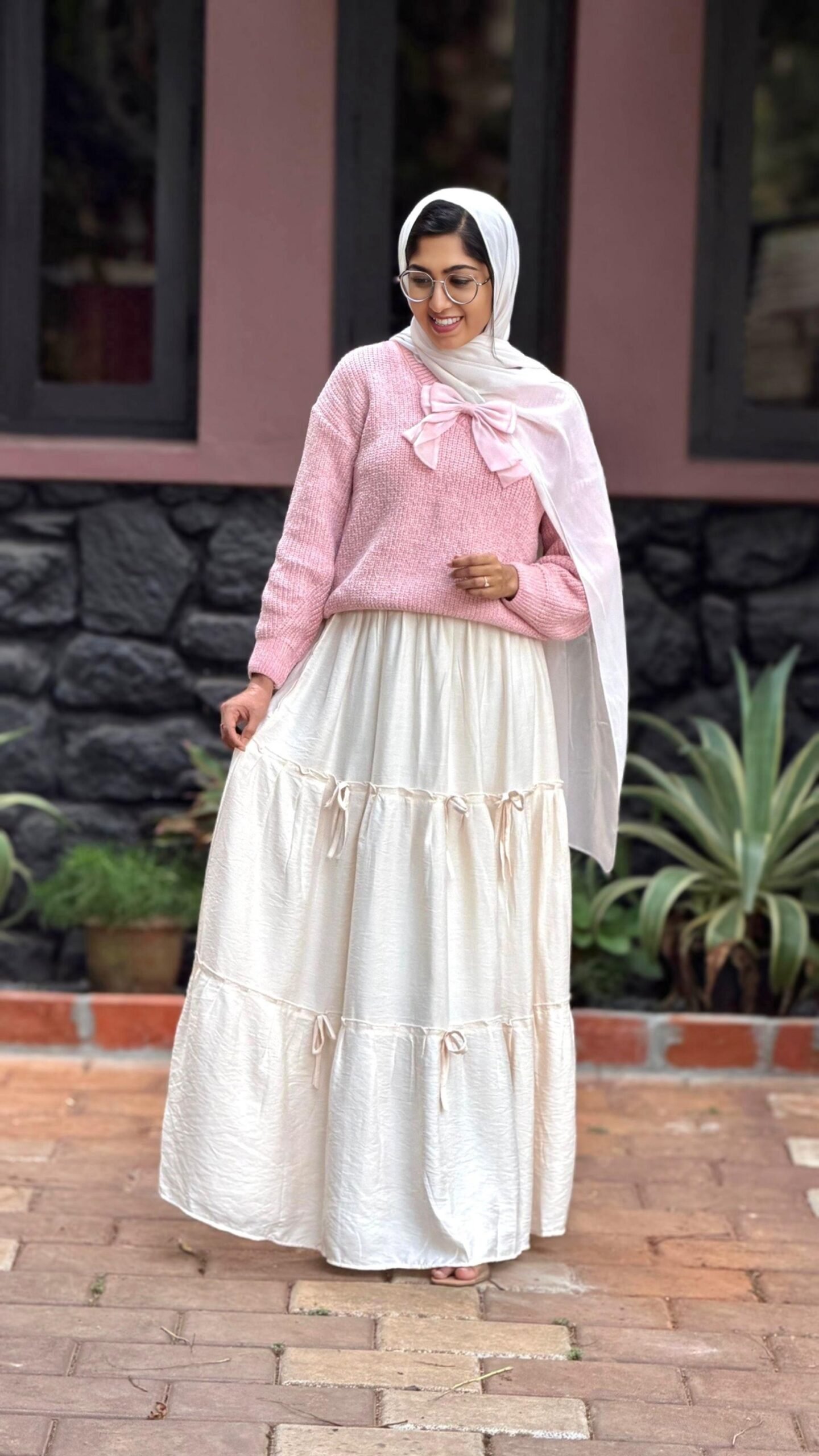 The Blush Harmony Skirt Set blends softness and elegance for a timeless modest look. The outfit features a cozy blush pink textured sweater with a delicate bow detail at the neckline, paired with a flowy ivory tiered maxi skirt that adds graceful movement. The combination of warm knit texture and airy fabric creates the perfect balance of comfort and sophistication. Ideal for casual outings, brunch dates, or relaxed gatherings, this set offers effortless style with a modest charm.
