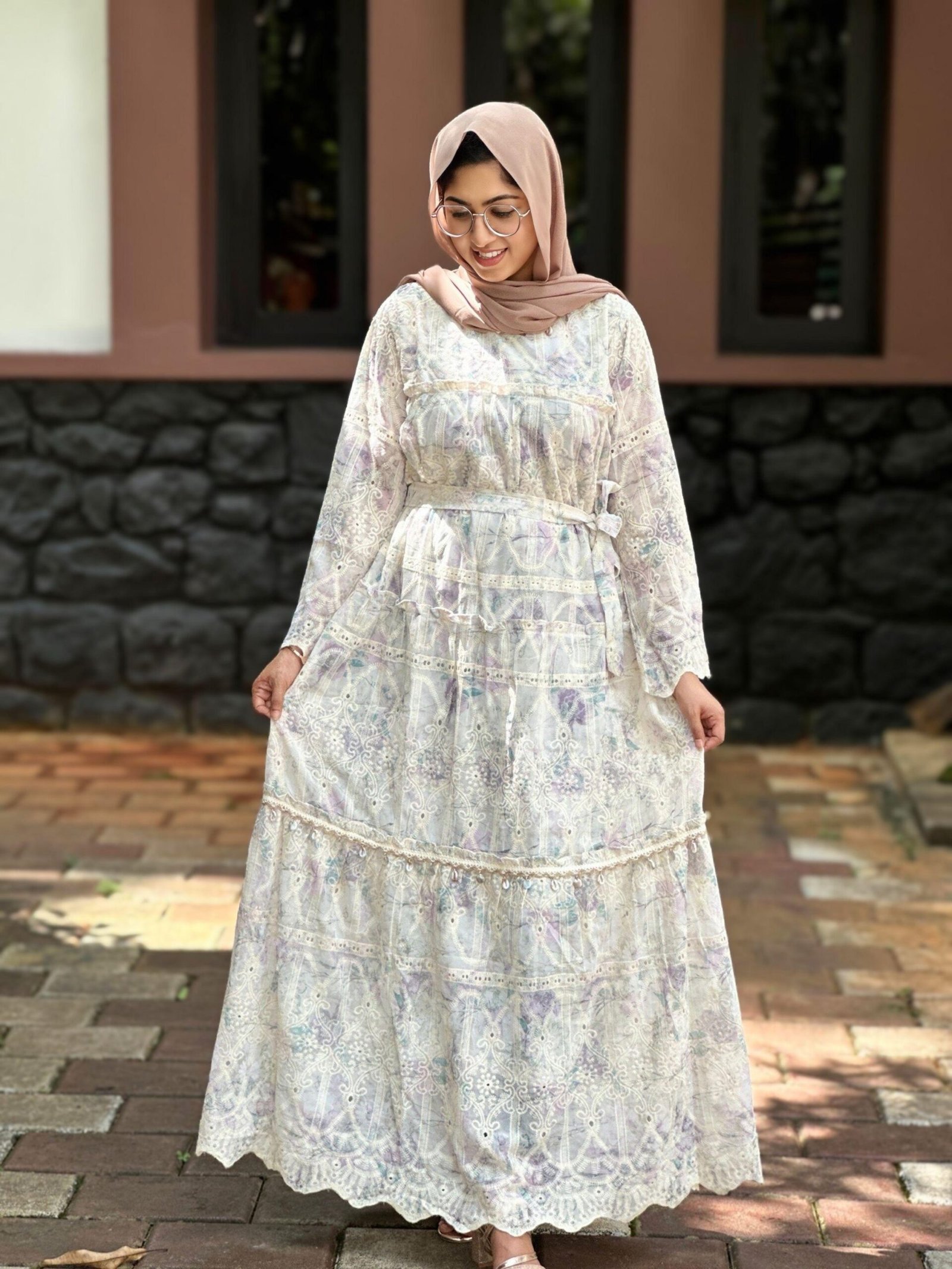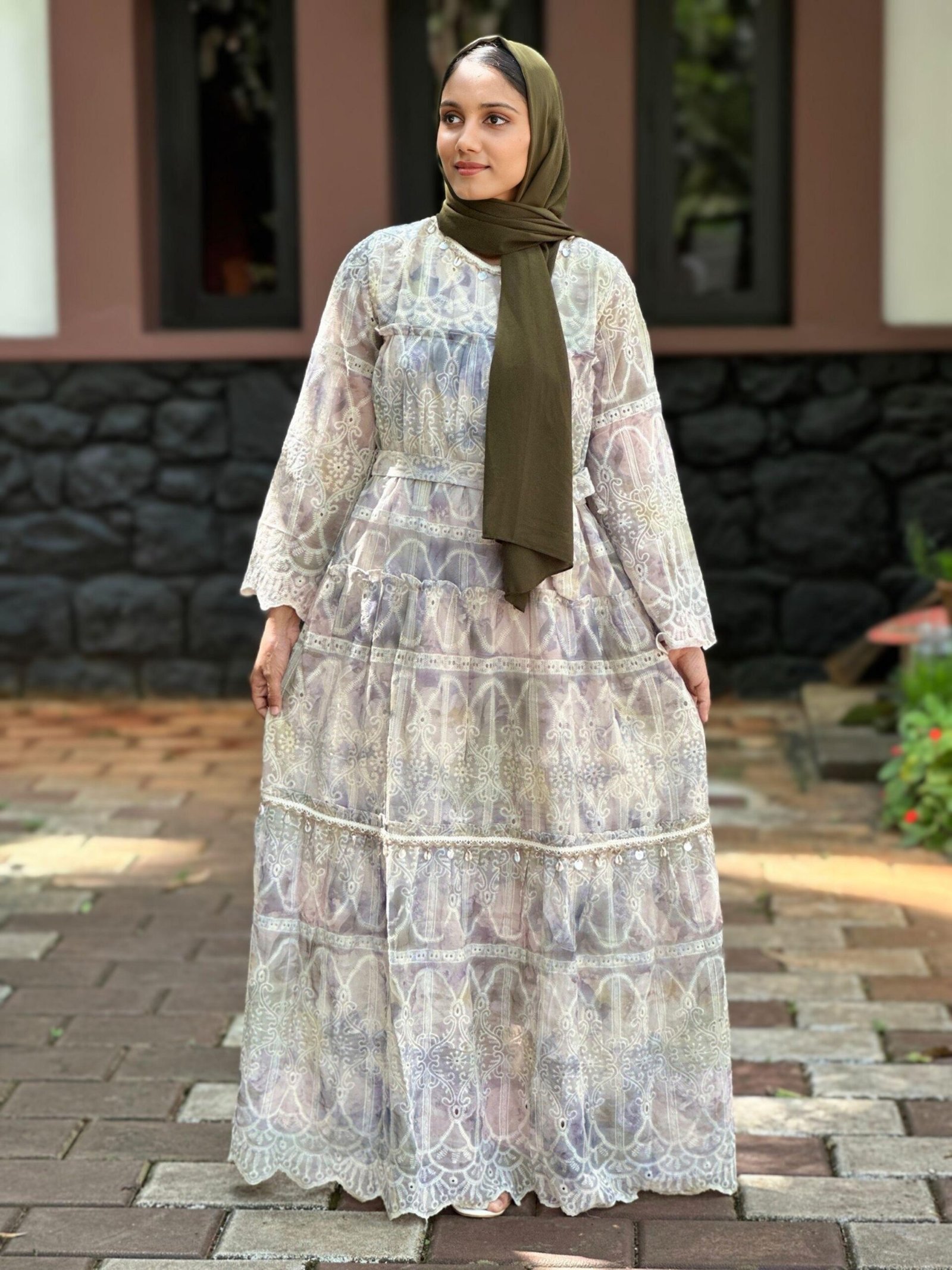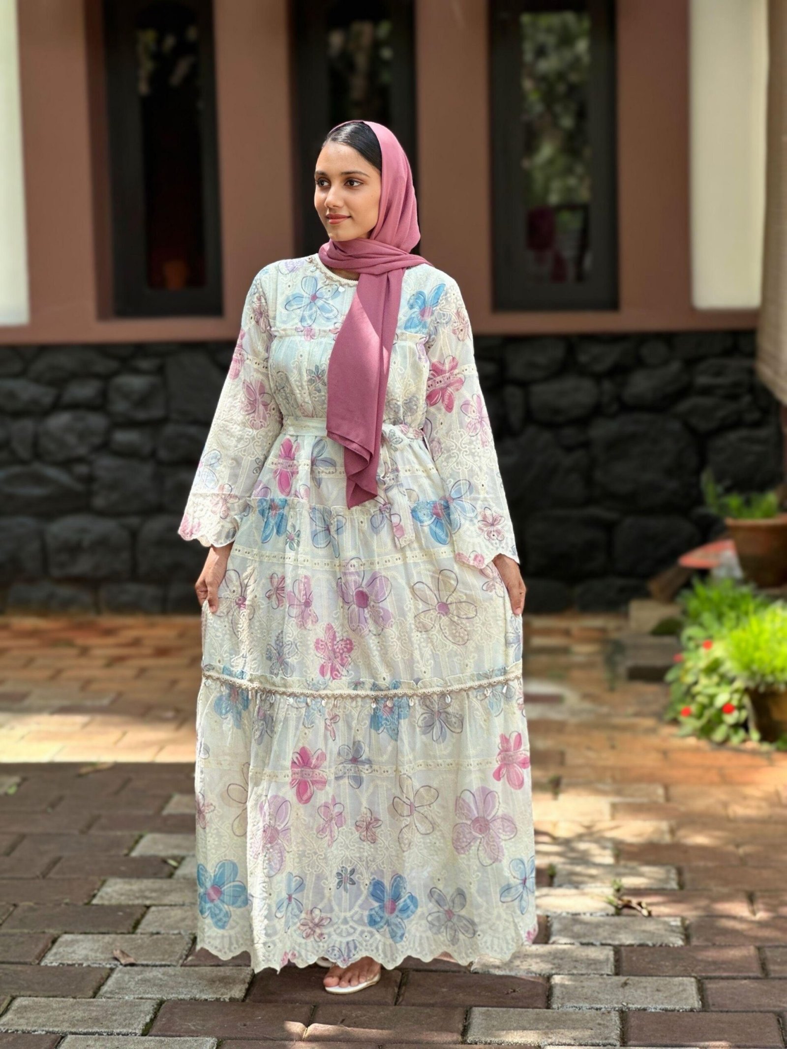 Intricate Eyelet Embroidery: The garment is overlaid with exquisite white Eyelet and Cutwork Embroidery, providing a stunning textural contrast to the floral print underneath. This lacy detail runs elegantly across the bodice and the ruffled hem of each tier.