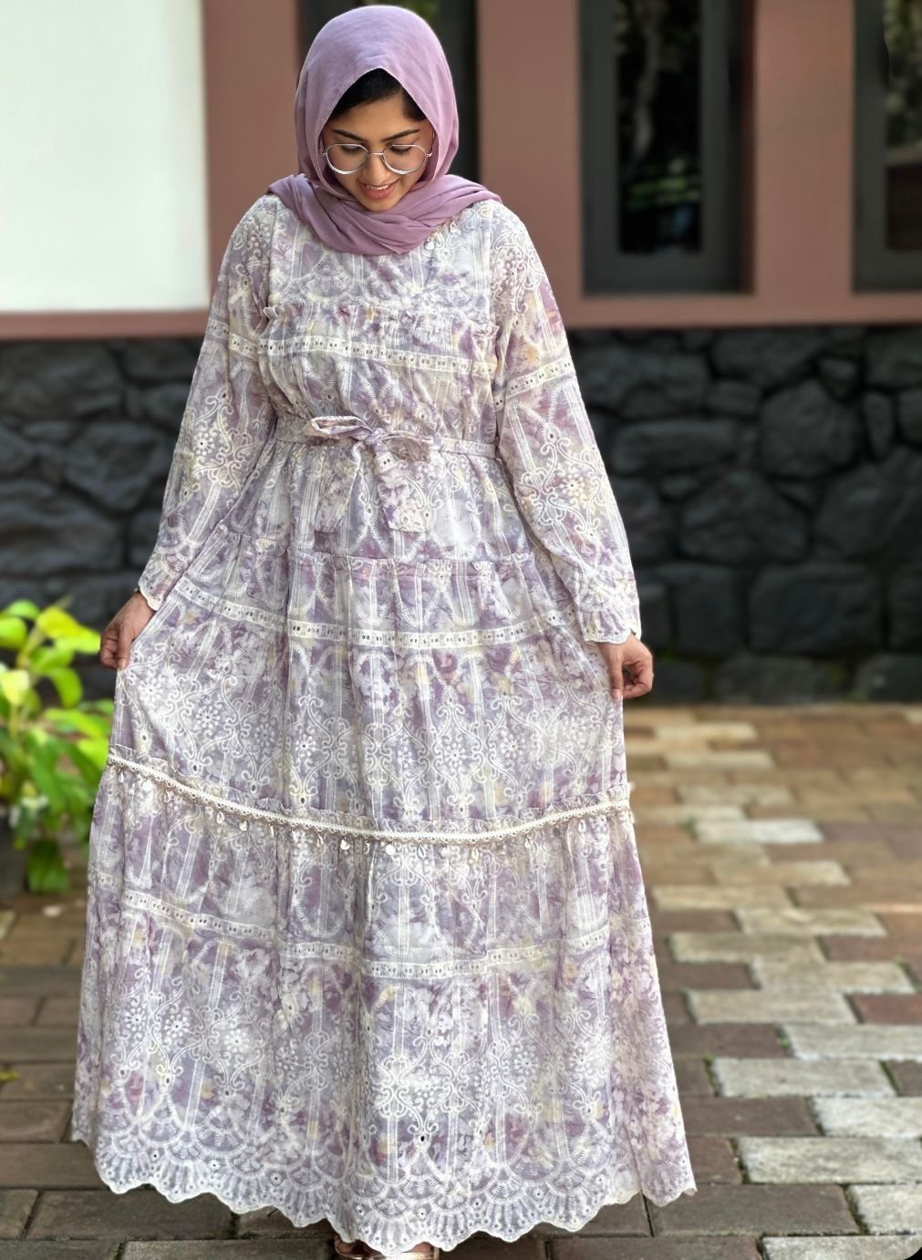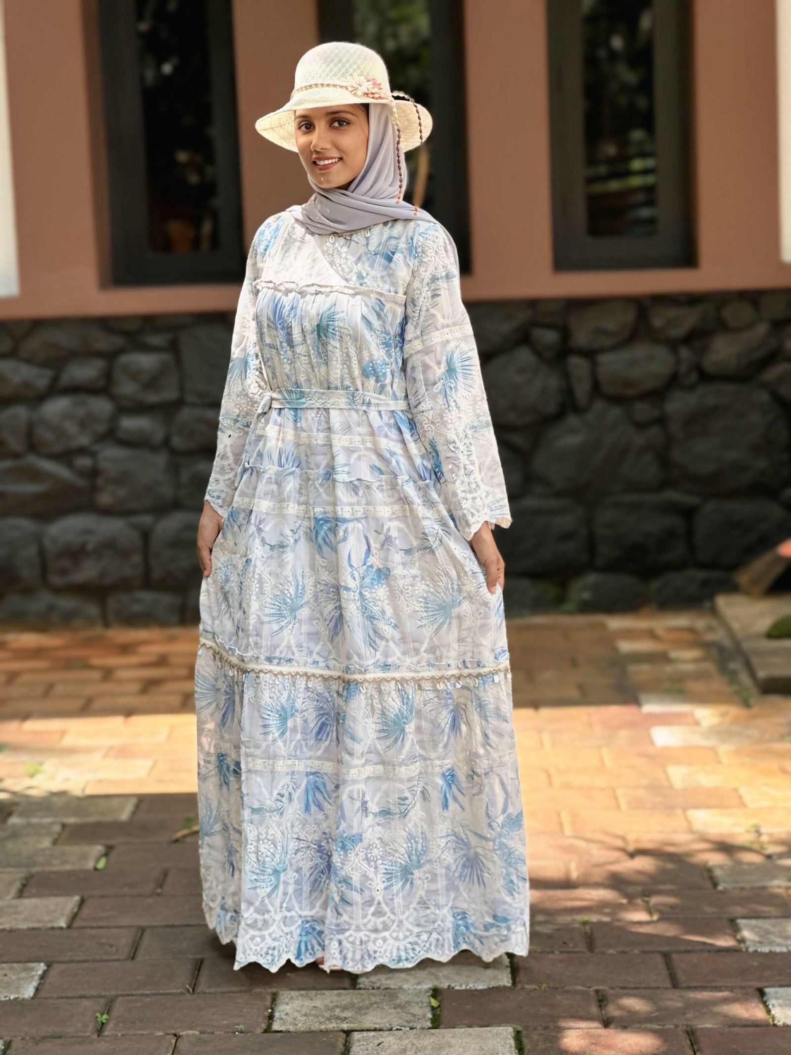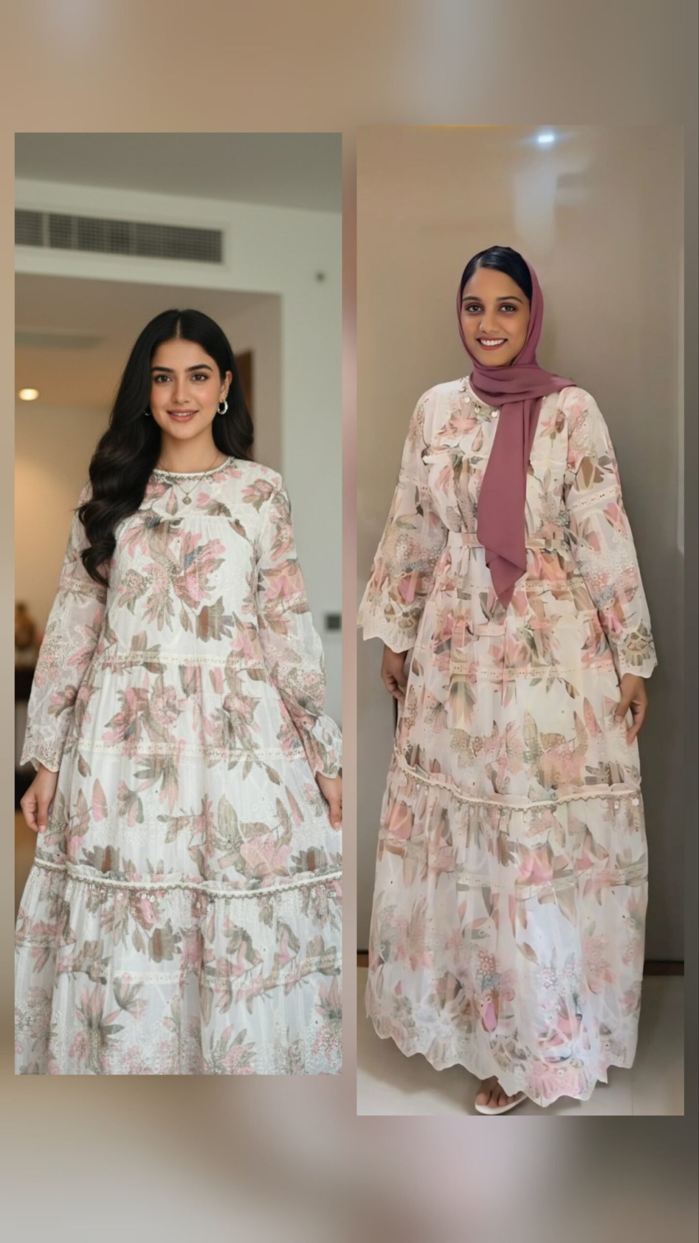 Intricate Eyelet Embroidery: The garment is overlaid with exquisite white Eyelet and Cutwork Embroidery, providing a stunning textural contrast to the floral print underneath. This lacy detail runs elegantly across the bodice and the ruffled hem of each tier.