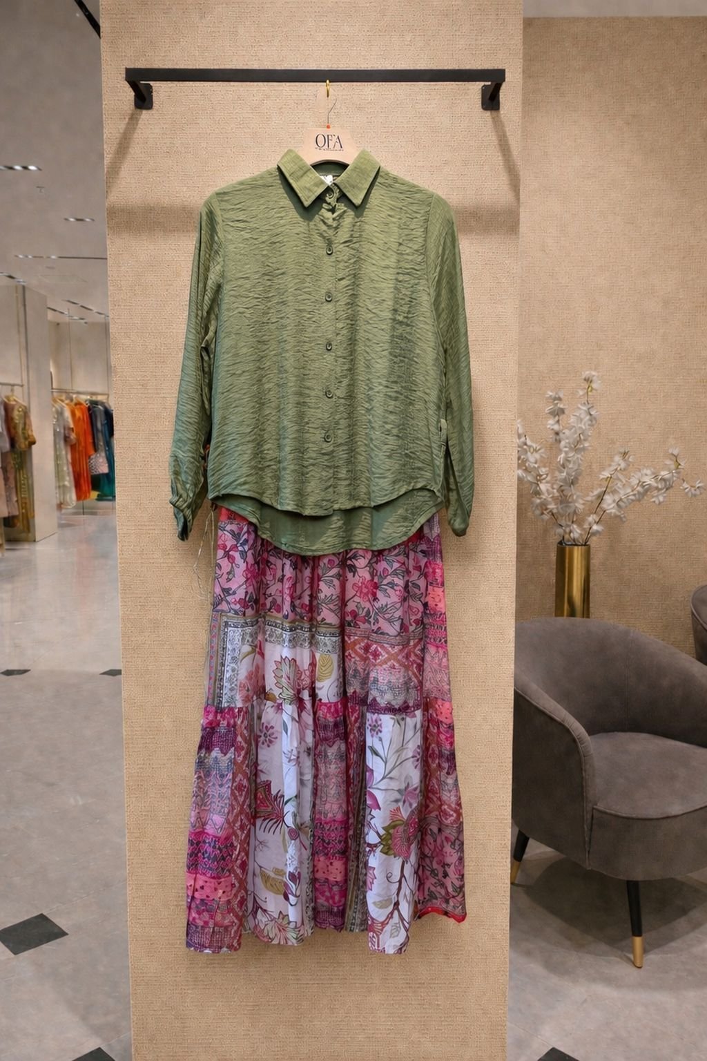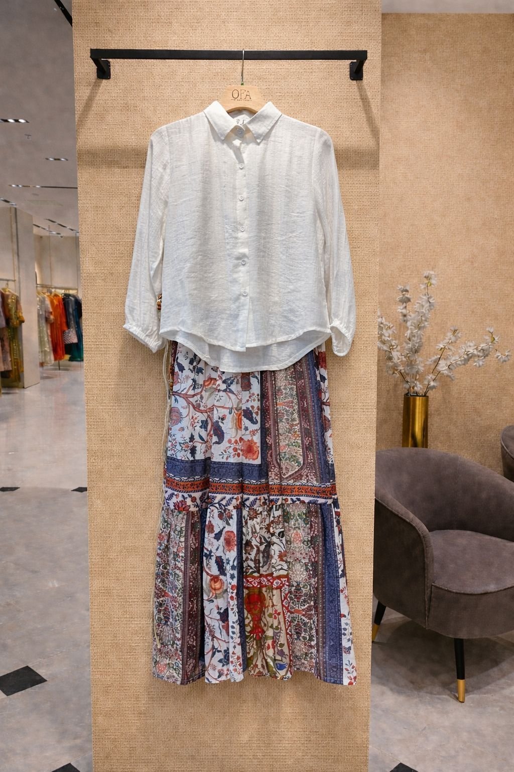 A stylish and effortless bohemian outfit featuring a soft, lightweight white shirt paired with a beautifully detailed patchwork maxi skirt. The skirt showcases a mix of floral and ethnic prints in earthy and vibrant tones, creating a unique and eye-catching look. Perfect for casual outings, vacations, or boutique wear collections.