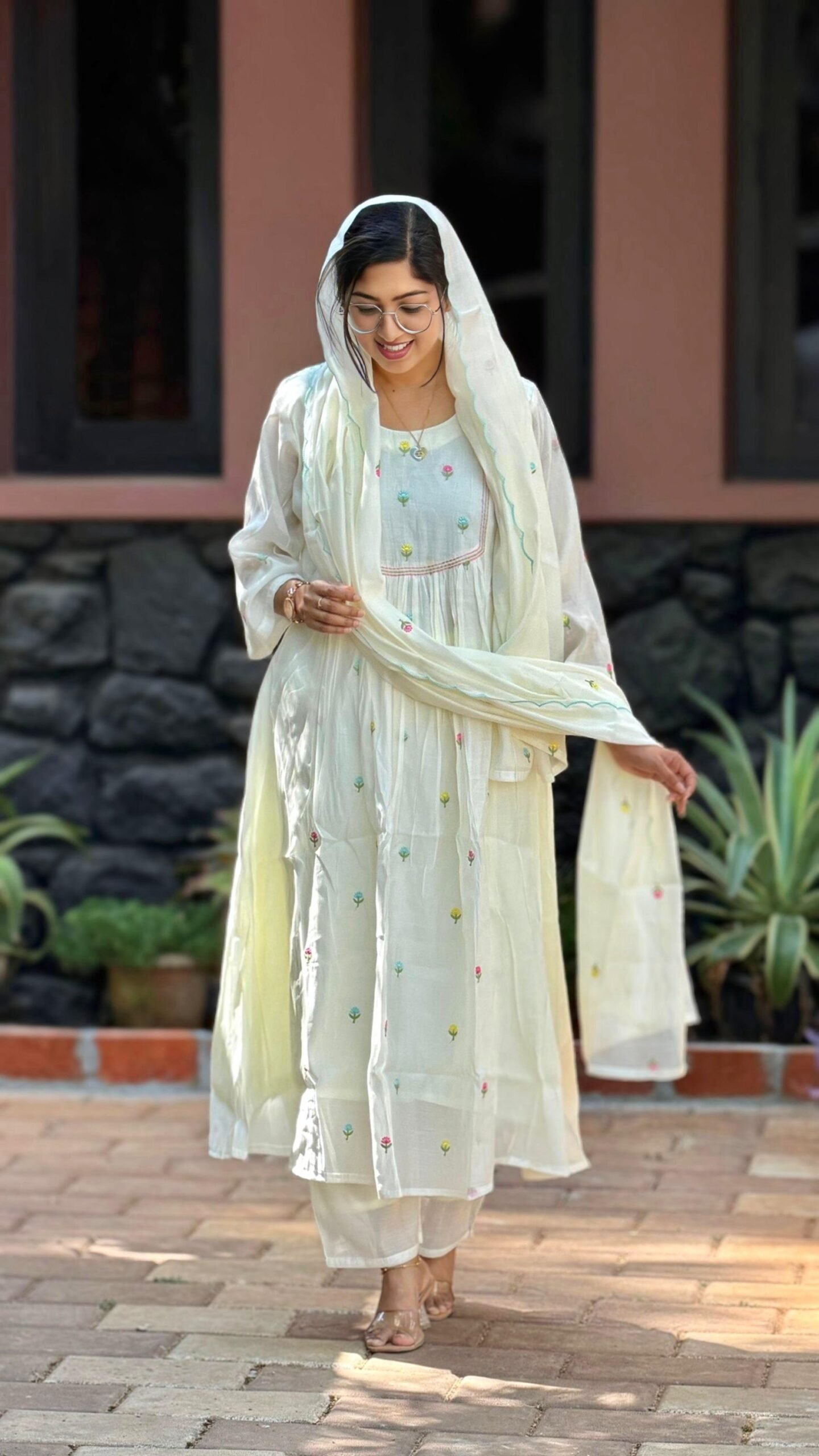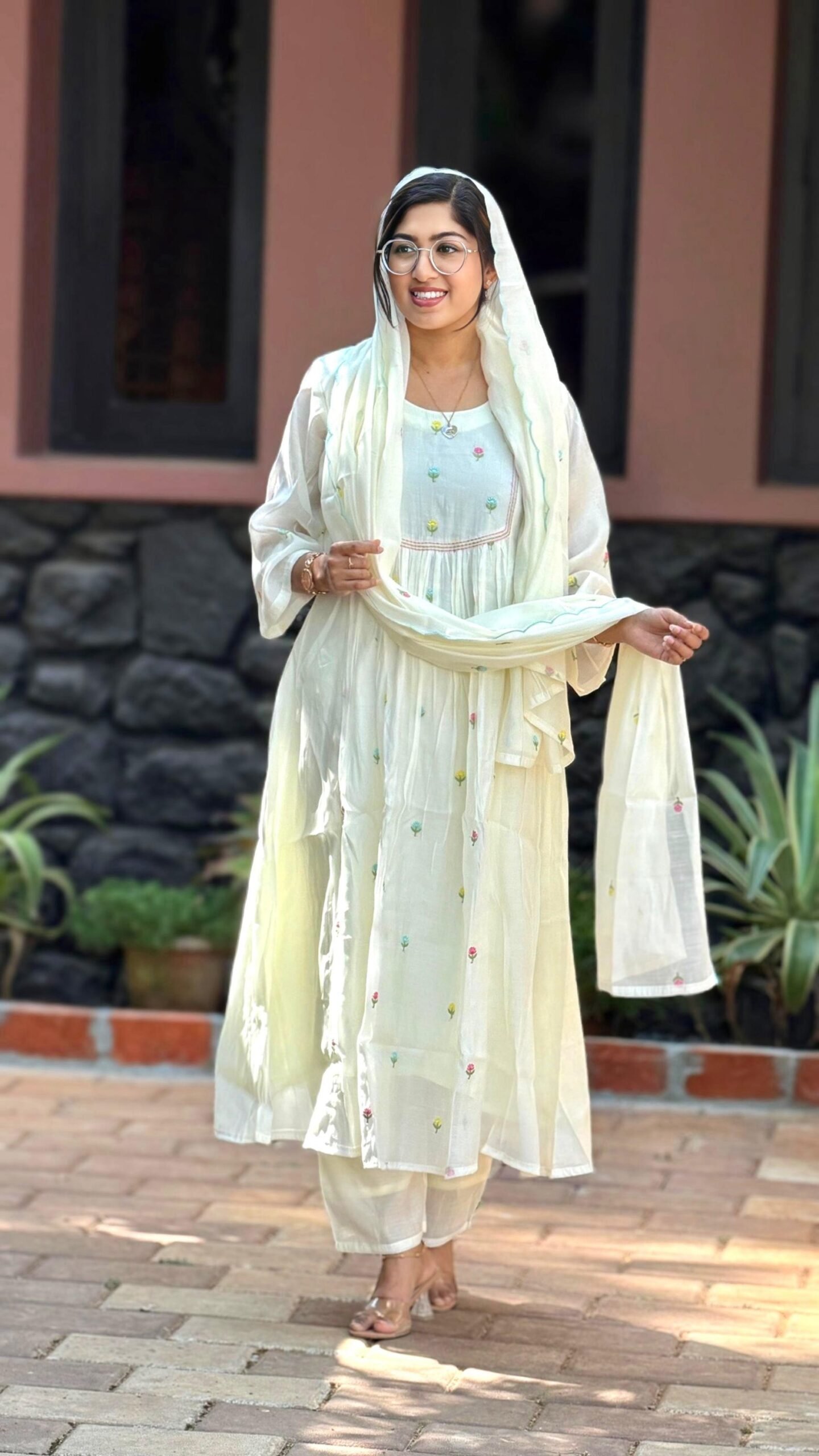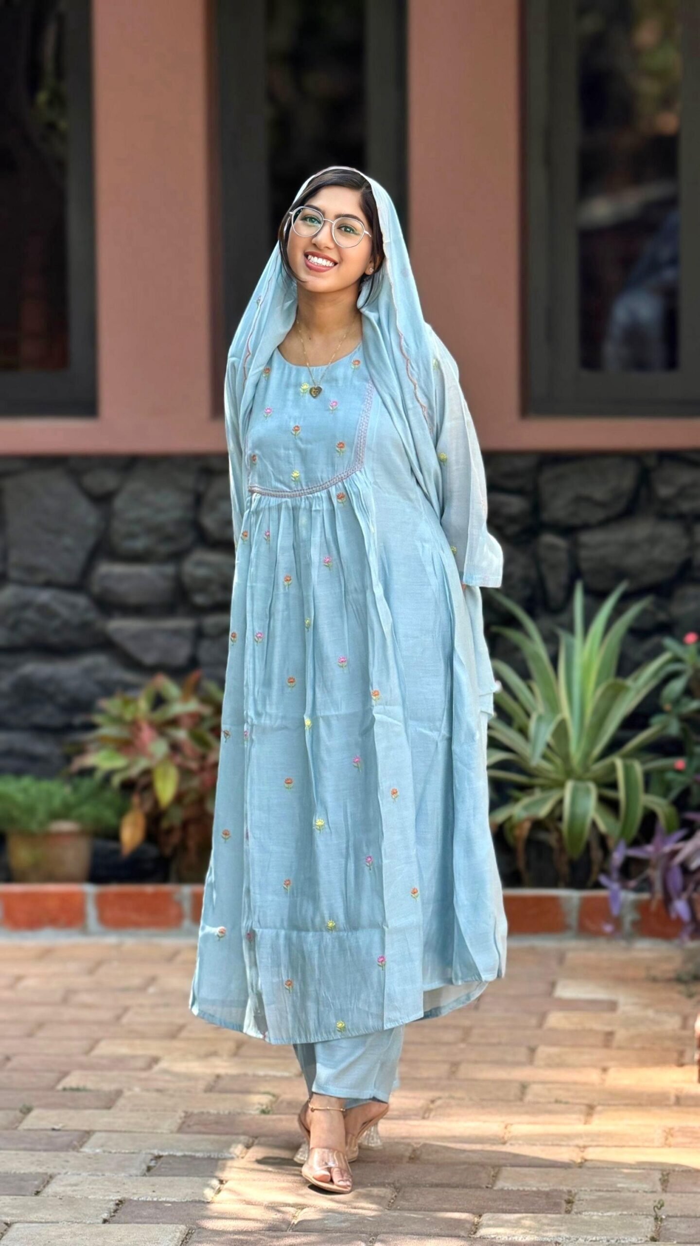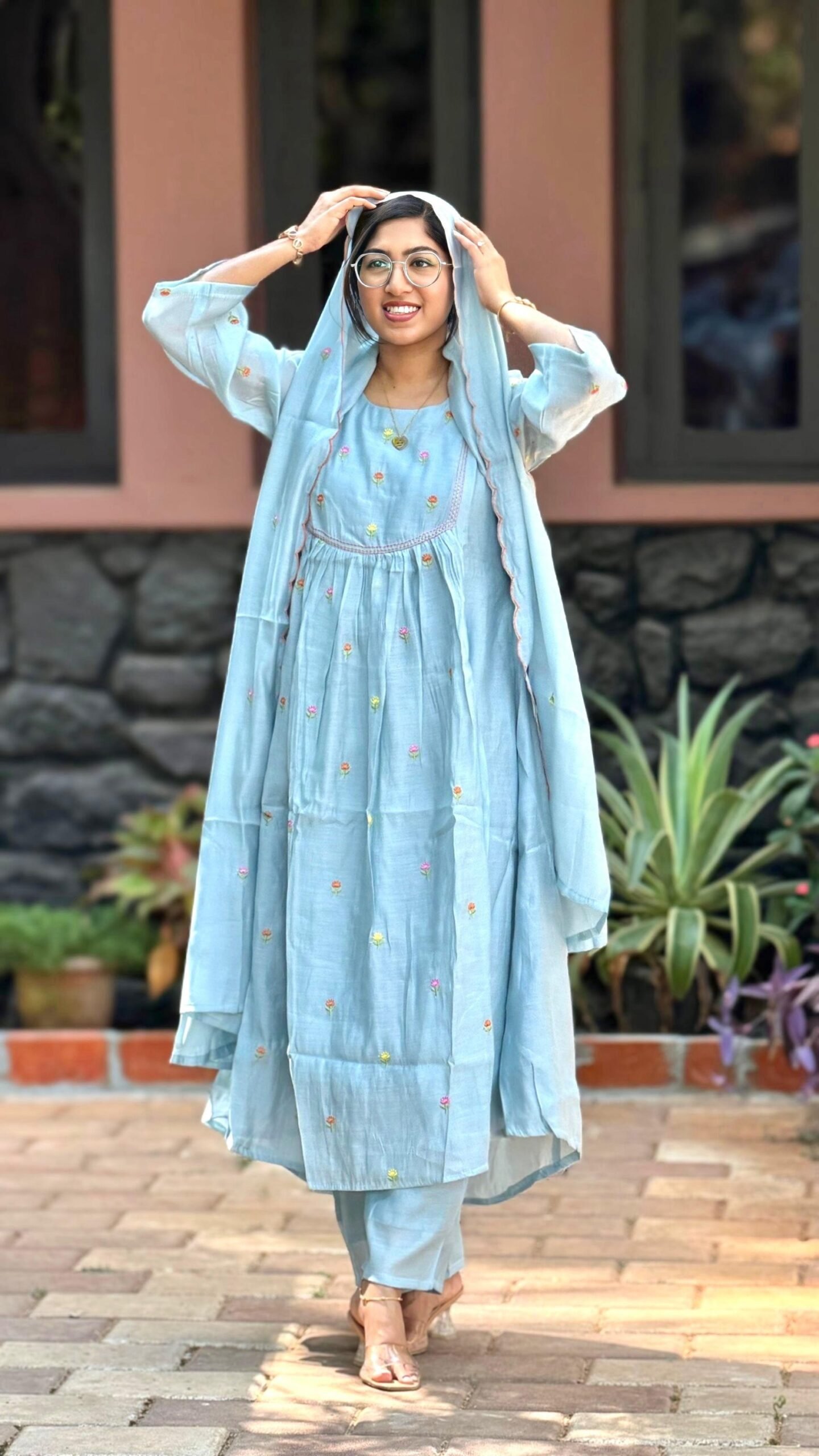 The Serene Bloom Anarkali Set is crafted in Glass Chanderi fabric, offering a perfect balance of comfort and elegance. This three-piece ensemble features an Anarkali top adorned with delicate all-over floral embroidery, designed to create a graceful yet understated look.