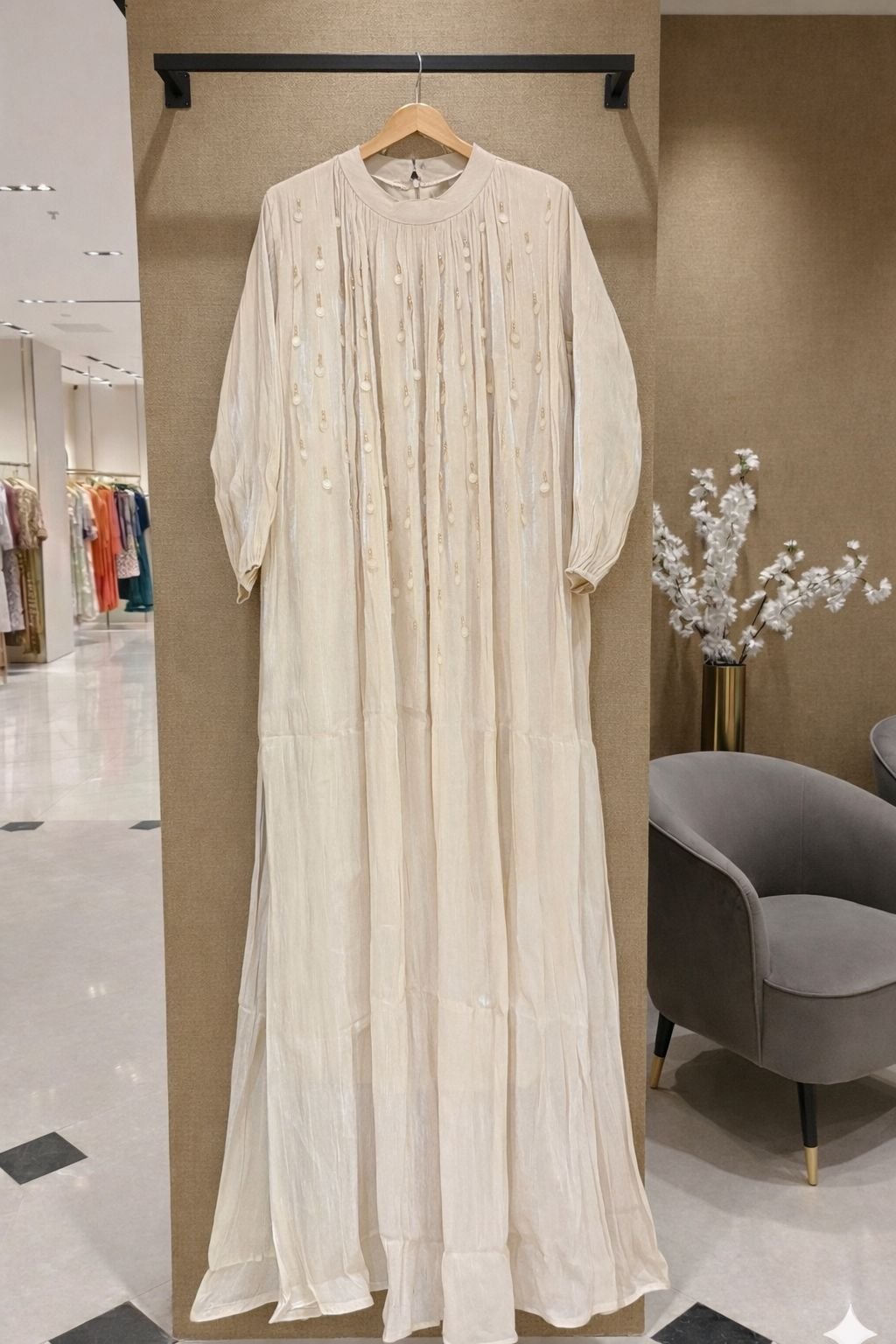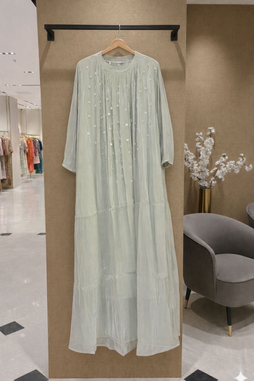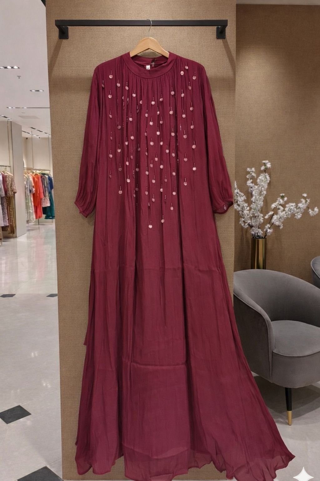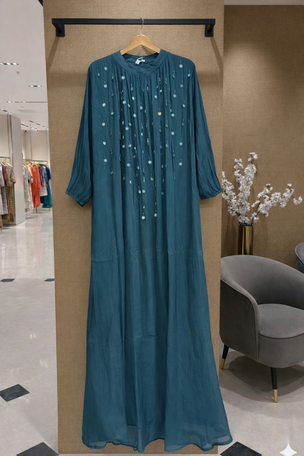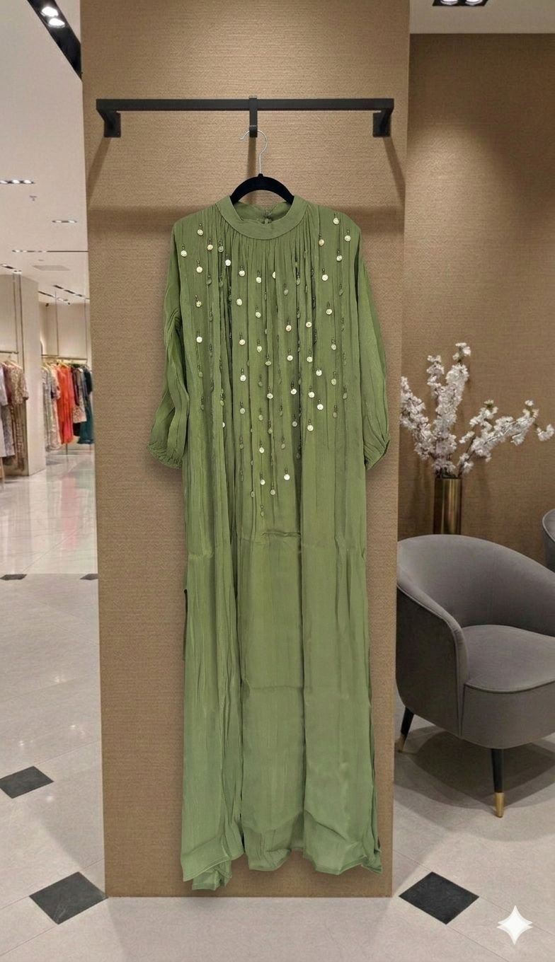 An elegant statement of soft shimmer and graceful flow, the Lumière Shimmer Maxi Dress is designed to flatter every silhouette. Crafted in a lightweight shimmer fabric, this dress features delicate embellishment detailing on the bodice and a beautifully draped full-length fall. The modest yet refined design makes it ideal for festive occasions, celebrations, and evening wear. Available in eight stunning shades, this timeless piece lets you choose the color that best reflects your style.