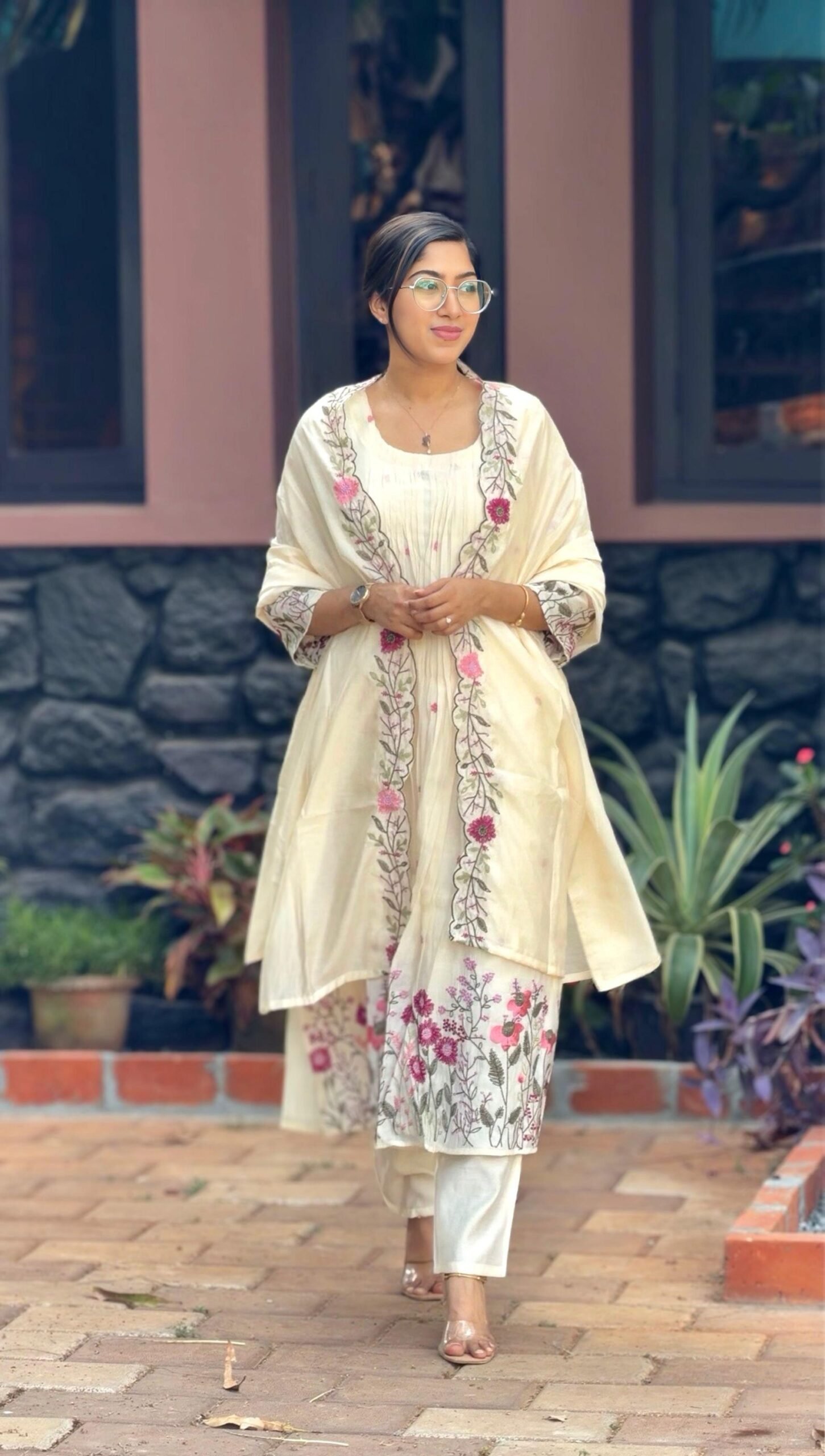 This embroidered Anarkali set is crafted in graceful Glass Chanderi fabric, known for its light texture and subtle sheen. Designed with a beautifully flared silhouette, the kurta features intricate embroidery that adds a refined and timeless charm. The flowy Anarkali cut offers effortless movement and comfort, making it perfect for festive occasions, family gatherings, and elegant day events. A classic piece that blends traditional craftsmanship with understated sophistication.