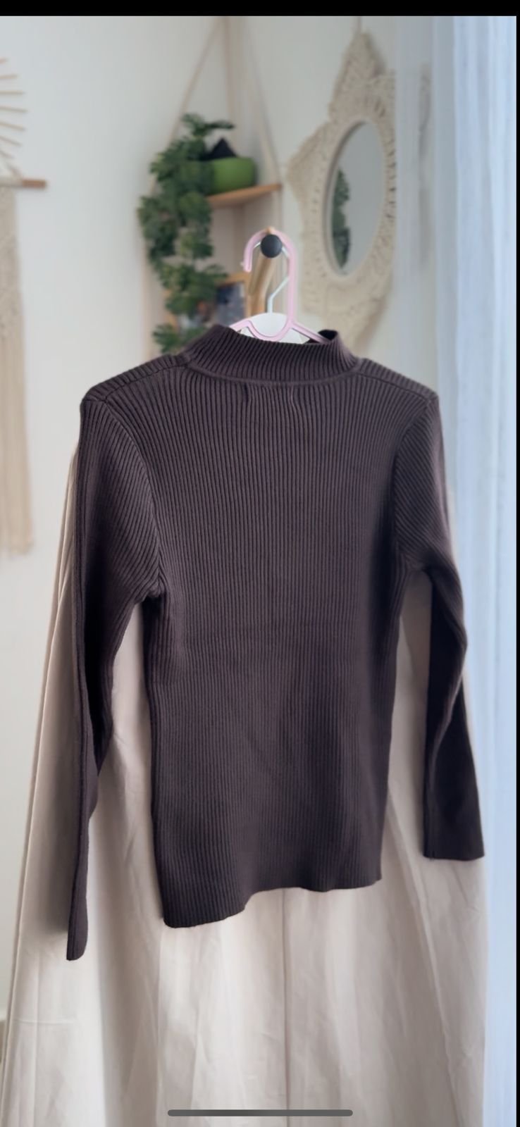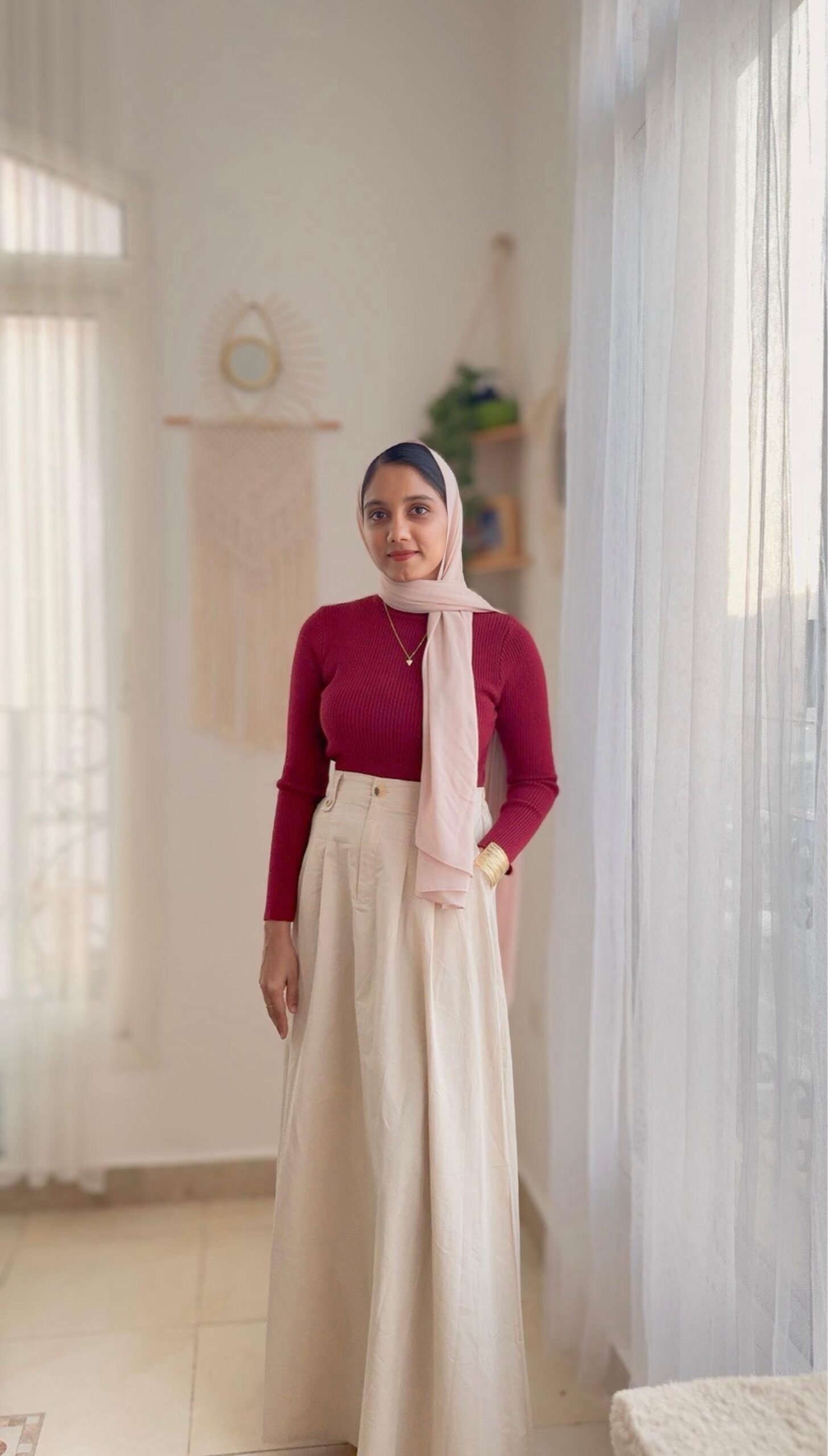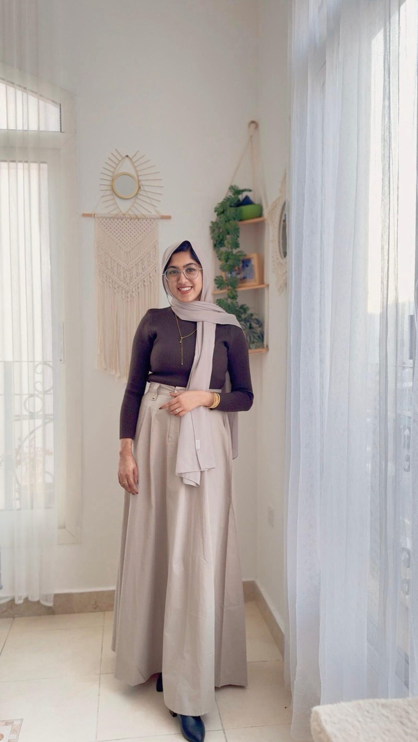 This outfit includes a fitted ribbed full-sleeve high-neck top paired with a flowy high-waist A-line midi skirt. It gives a modest, elegant, and minimal look suitable for daily wear or semi-formal occasions.