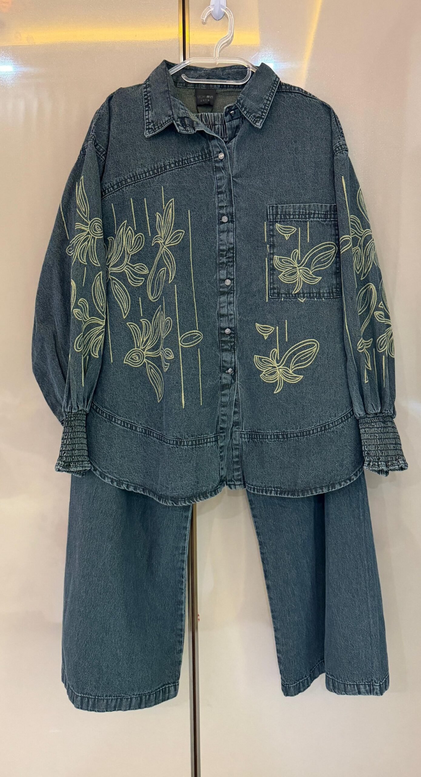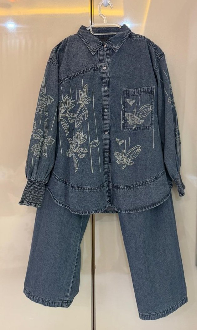 Blends effortless comfort with artistic detailing. Crafted in soft, breathable denim, this relaxed-fit shirt and wide-leg pant set features delicate floral line embroidery that adds a subtle statement to everyday dressing. Designed for modern modest wear, it offers a laid-back yet polished look—perfect for casual outings, travel days, or elevated everyday wear.