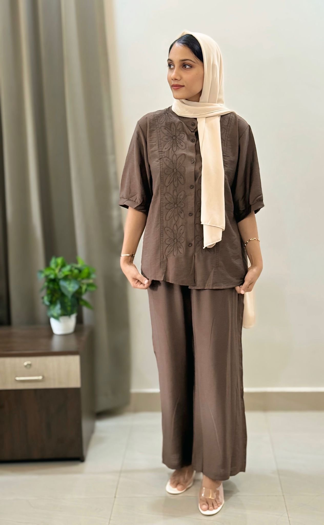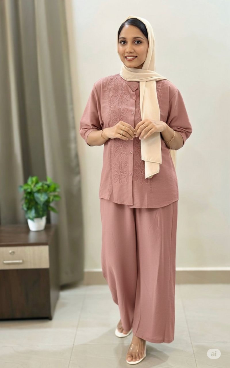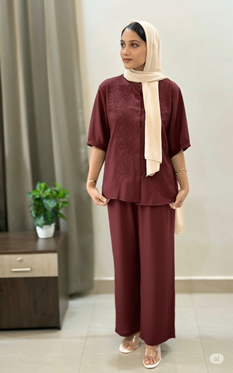 The matching straight-fit pants come with an elastic waistband for a comfortable fit and effortless silhouette. Simple, airy, and easy to style—perfect for casual or semi-formal outings.