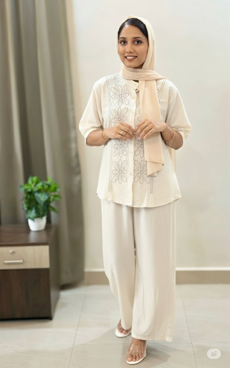 The top features delicate floral thread embroidery on the front panel, showcasing intricate daisy-inspired patterns that add a feminine and elegant touch. Designed with a short stand collar, Opanable front button, and half sleeves with gentle gathers at the cuff for a relaxed yet refined look.