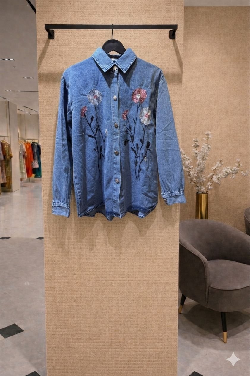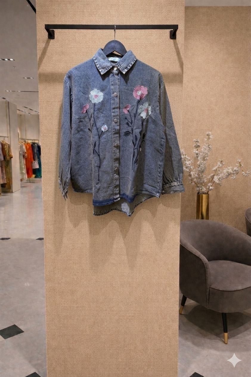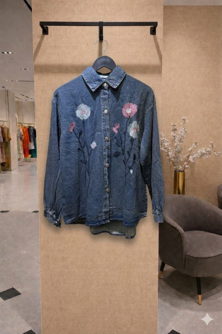 MaterialPremium mid-weight Denim (available in light, medium, and charcoal washes).DetailingDelicate multi-color floral embroidery with long-stem accents.StyleWestern-style modest button-down with a structured collar.FitRelaxed, slightly oversized fit with cuffed sleeves.